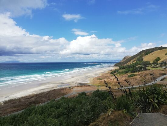Spannender als das Kap selber ist die Landschaft drum herum. Denn im Umkreis von gut dreißig Kilometern erstreckt sich eine absolut einmalige Wildnis. Hier ist mal wieder der Punkt erreicht, an dem wir uns dachten, das Neuseeland jetzt einfach nur noch angeben will. Denn neben den steilen Felsen, den zahlreichen verlassenen Buchten und dem buschigen Outback-Feeling hielt die Natur es hier für angebracht, noch Kilometer lange gigantische Sanddünen in die Landschaft zu pflanzen. Natürlich darf bei dieser Komposition der 90-Mile-Beach nicht fehlen, der sich wie ein ewiges Band aus Sand zwischen Meer und Dünen erstreckt.