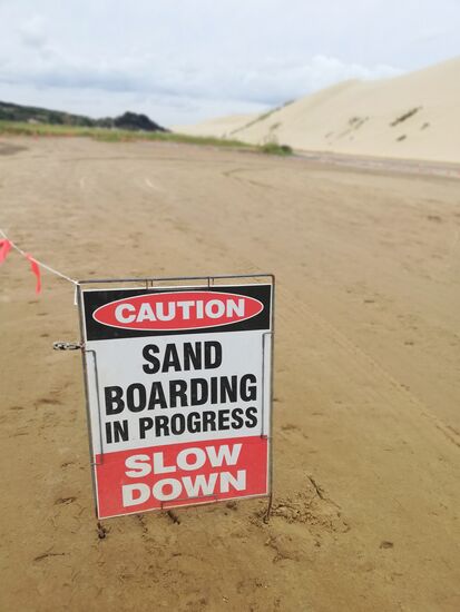 Unsere vorletzte Unterkunft lag etwa auf einem Drittel des Weges zwischen dem Kap und Auckland in dem Ort Opononi. Wir fuhren bis dorthin fast in einem Rutsch durch und stoppten nur kurz in einem kleinen Maori-Dorf namens Kohukohu und nahmen von dort eine kleine Autofähre, um uns den Umweg um den tief ins Land ragenden Hokianga Harbour zu sparen. Als wir schließlich in Opononi ankamen, staunten wir nicht schlecht: An der Mündung des natürlichen Hafens gelegen, konnten wir von hier bis auf die andere Seite blicken. Und dort lag die wohl formvollendetste Sanddüne der Welt. Wir hatten überhaupt nicht gewusst, dass es so weit südlich auch noch Dünen gibt, und konnten deshalb während der zwei Tage hier unseren Blick kaum von dieser Szenerie abwenden.