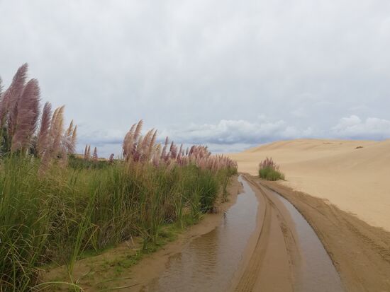 Weiter südlich ist der Strand besser besucht. Hier drehen wir eine kleine Runde auf dem harten Sand. Eine richtige Fahrt trauen wir uns dann aber doch nicht.