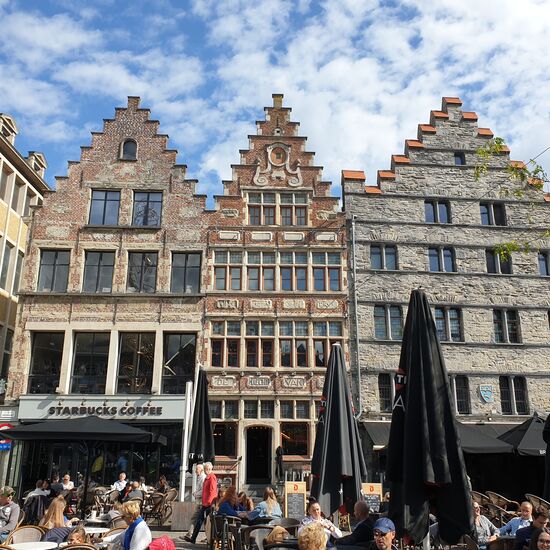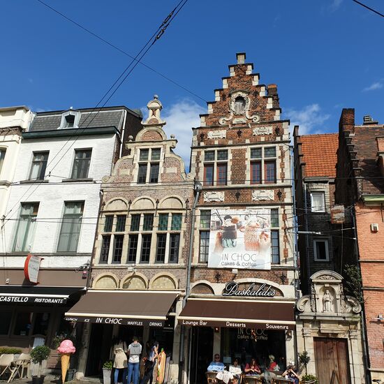 Überall Kaufmannshäuser aus dem Mittelalter. Hier galt wohl schon im Mittelalter; größer, schöner, besser. Bunte Fenster, in Stein gemeisselte Inschriften aus dem Mittelalter. Jeder Besitzer ließ sich noch etwas mehr einfallen, um beim Nachbarn zu protzen. Was mich so erstaunt hat, Ghent schien auch weitgehend heile durch den zweiten Weltkrieg gekommen zu sein. Soviel Mittelalter ist schon fast zuviel auf einen Schlag. Es war "fast nicht mehr auszuhalten".