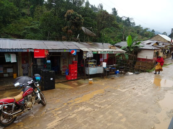 Der Regen hat die Straßen in schlammige Pisten verwandelt. Die Einheimischen trotzen dem Wetter und einige sind sogar barfuß unterwegs.