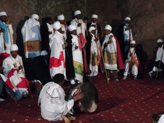 Mit dem goldenen Kreuz werden wir gesegnet. Er berührt immer wieder meinen Kopf an allen Seiten mit dem Kreuz.