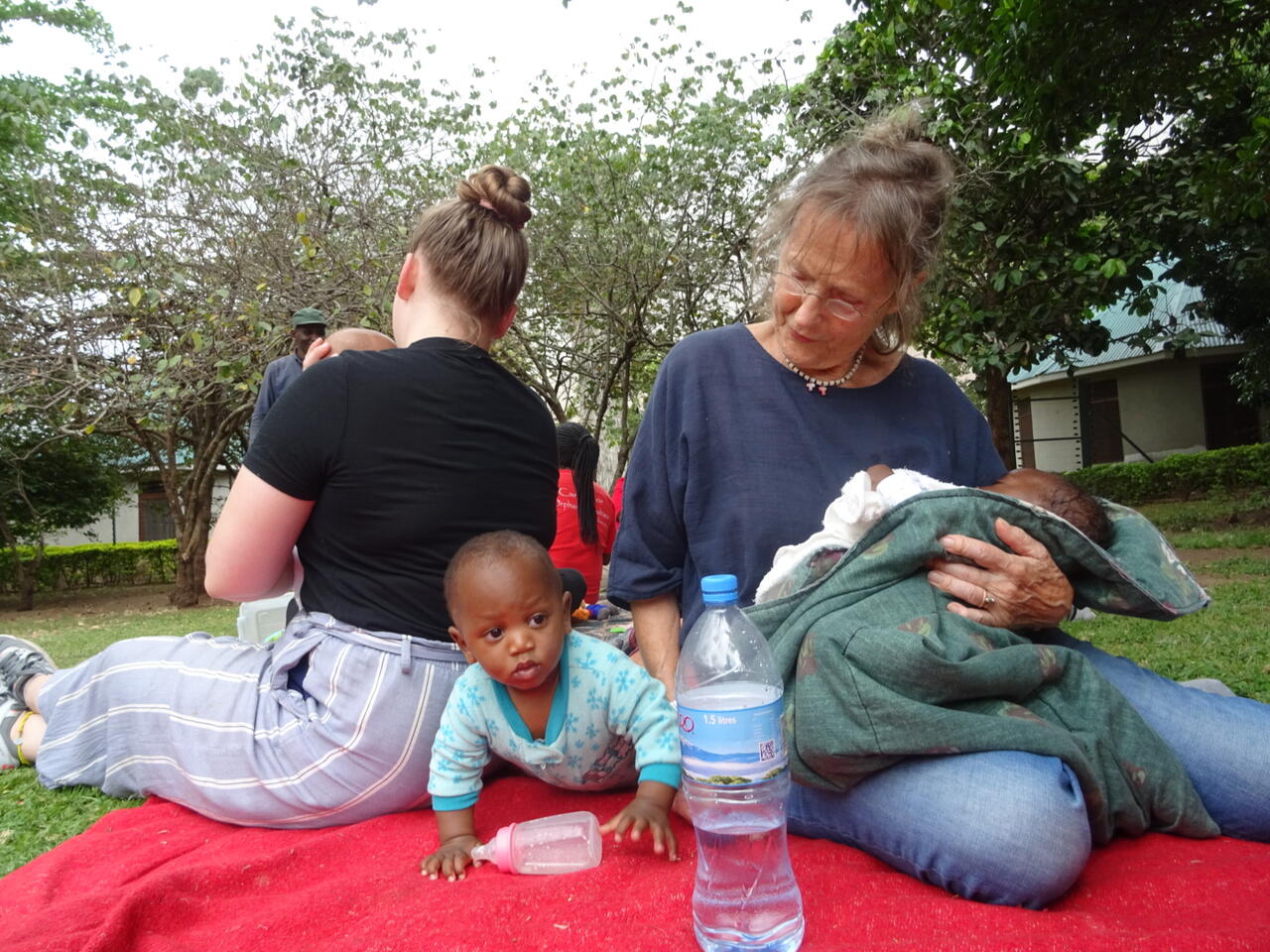 Als wir ankommen sitzen einige Volunteers gerade mit den Baby draussen im Schatten. Darunter zwei Findelkinder, die man auf dem Feld gefunden hat. Eines hatte starken Sonnenbrand, das andere noch die Nabelschnur am Bauch - so traurige Geschichten.
