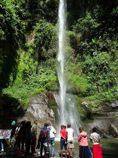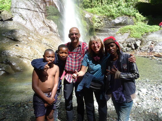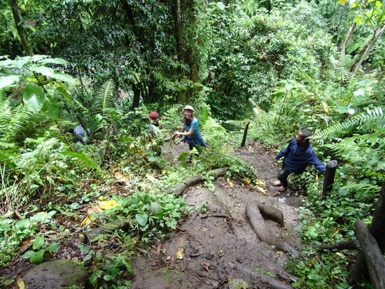 Zunächst geht es auf der gut ausgebauten Straße Richtung Arusha. Nach einigen Kilometern geht es dann auf einem "naturbelassenen" Weg weiter. Schlaglöcher, tief eingefahrenen Fahrspuren lassen diese Holperpiste zur Tortur werden. Außerdem ist alles vom Regen aufgeweicht. Es geht steil den Berg hinauf und die Räder des Taxis drehen durch. Der Fahrer winkt Männer heran, die schieben und so gelingt es noch ein Stück weiter zu fahren. Doch dann kommt eine Stelle, da rutscht das Fahrzeug nur noch hin und her. Wir beschließen von hier die letzten zwei - drei Kilometer bis zum Eingangstor zu Fuß zu gehen. Es dauert nicht lange und zwei Einheimische Jugendliche schließen sich uns an. Ich ahne schon, dass sie auf einen Verdienst hoffen.