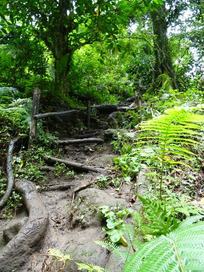 Zunächst ist der Weg ganz leicht und fast eben. Doch dann geht es auf aufgeweichten, rutschigen Boden steil bergab. Teils auf Treppen, Holzstiegen oder zwischen dem Gestein. Ich bin sehr schnell froh, daß die Jungs mir ihre helfenden Hände entgegen Strecken. Allein hätte ich es niemals geschafft!