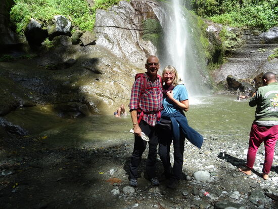 Am Eingang zum Wasserfall zählen wir jeder 22000TS, für unseren Einheimischen Taxifahrer zahlen wir nur 10000TS. Nun kommen auch die zwei Jungs ins Spiel, sie wollen uns als Guide bergab begleiten. Wir winken ab, denn wir haben ja unseren Taxifahrer dabei. Die Beiden gehen aber trotzdem mit.