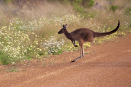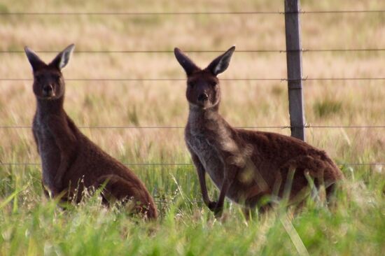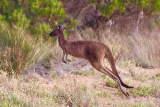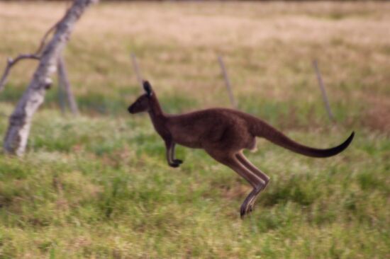 Bei Ankunft an unserer Unterkunft standen dann plötzlich zwei weitere Kängurus hinter dem Zaum. Sie hielten sich wohl für nicht sehr fotogen und suchten blitzartig das Weite.