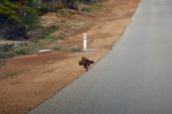 Bei der Weiterfahrt, schon von weitem sichtbar, lag etwas Graues, zunächst nicht identifizierbar, mitten auf der Straße. Wir verringerten das Tempo. Von rechts näherte sich -eher zögerlich- vermutlich ein Fuchs. Dann sprang er los, schnappte sich das Tier (vielleicht ein Hase) und gab Fersengeld.