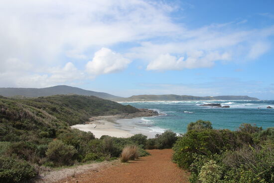 Beim Frühstück stellen wir fest: es ist richtiges April-Wetter. Regen und Sonne wechseln z.T. im Minutentakt, dazu heftiger Wind und Kälte. Kaum ist der Himmel mal freundlich und blau, ziehts wieder zu und es wird nass. Der Tag wird spannend, gilt es doch die out-door-Aktivitäten so zu legen, dass sie in die Trockenphasen fallen. Anders gesagt: eine Galerie, ein Café und natürlich unser Auto helfen dabei, trocken zu bleiben und trotzdem Sinnvolles zu tun. Wir verschieben Geplantes auf den späteren bzw. den nächsten Tag und fahren die Küste entlang Richtung Denmark. Den am Weg liegenden Buchten statten wir jeweils einen Kurzbesuch ab.