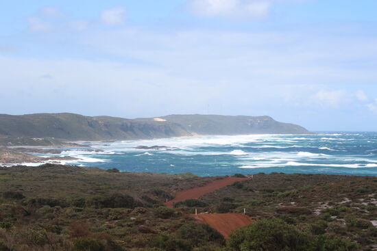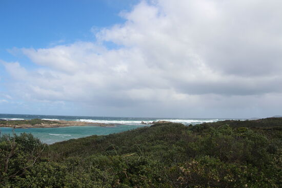 Auf der weiteren Fahrt stellen wir fest, dass der Wind mächtig auffrischt. Einen Blick aufs Meer bei Northcliff lassen wir uns nicht entgehen: Himmel und Wasser - alles grau, heftige Wellen mit weißen Schaumkronen, der Wind ist so stark, dass wir uns dagegen legen können ohne umzufallen und ehe wir uns versehen beginnen heftige Regenschauer. Wir schaffen es nur halbwegs trocken zurück ins Auto. Weiter nach Walpole.