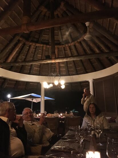Nach Sonnenuntergang bleibt dann auch keine Zeit, da wir uns sofort in das etwas außerhalb liegende Jungle-Restaurant des Hotels begeben. Dort erwartet uns ein üppiges Buffet, von dem wir nur noch Spuren probieren können, aber ‚nur‘ Wasser wollen wir auch nicht trinken. Daher ordert meine Frau Ulrike zwei lokale Bier (Castle) – es schmeckt!