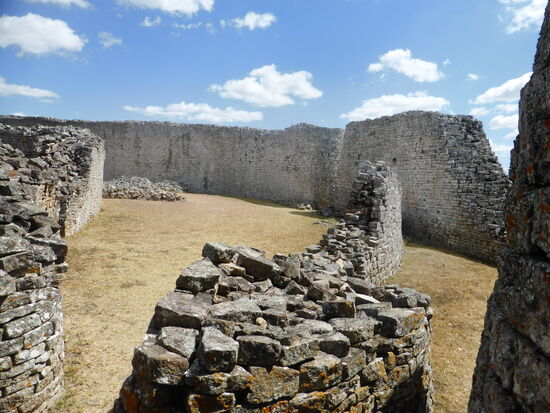 Die Große Einfriedung (big enclosure) wurde von den Einheimischen im 19. Jahrhundert als Imba Huru (Großes Haus) bezeichnet. Die Mauer hat eine Länge von 255 Metern; es sollen etwa eine Million Steine vebaut worden sein. Von den Ruinen im Tal kommend blickt man auf den nordöstlichen Mauerteil, der mit einer Höhe von elf Metern und einer Dicke von vier Metern an der Oberkante und bis zu sechs Metern an der Basis massive Ausmaße annimt. .