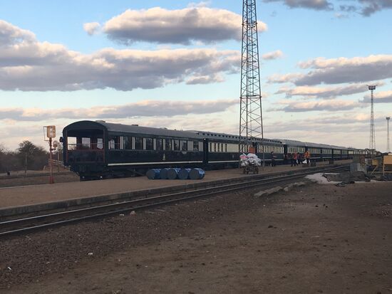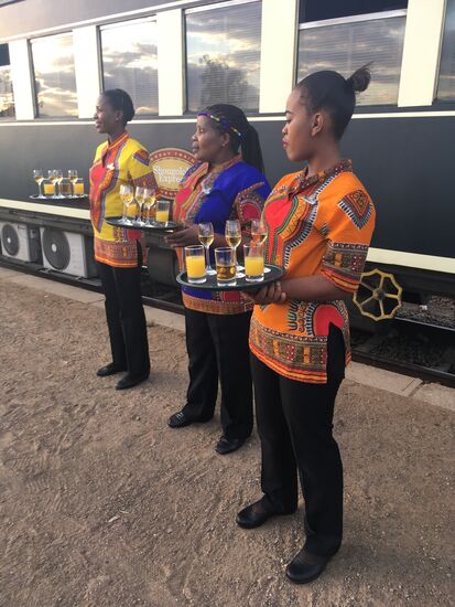 Unser ug ist derweil von Oreti weitergefahren nach Rutenga. Den Bahnhof dieses Ortes (21,25°S/ 30,73°O ) erreichen wir schließlich mit den Bussen gegen 17:10 Uhr. Am Zug gibt es heute südafrikanischen Dessertwein zur Begrüßung – nur der gestrige Rote Teppich fehlt.