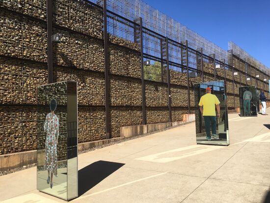 Vor dem Museum sieht man 7 Betonsäulen: beschriftet mit: democracy, reconciliation, diversity, responsibility, freedom, respect und equality!