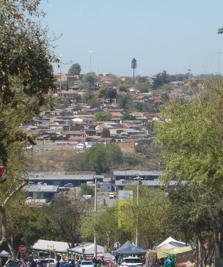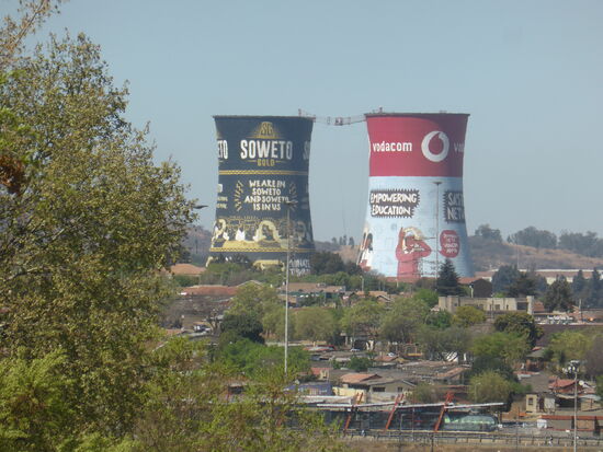 Die Fahrt nach Soweto führt wieder an dem mit Textil verkleideten Stadion der Fußballweltmeisterschaft vorbei, man kann zwar einige kleine Areale sehen, die schlimm aussehen, aber andere – so erklärt es uns der Führer – sind inzwischen mit festen Bauten versehen, die als ‚matchboxes‘ genannt Zweizimmerhäuser darstellen. Es gibt aber auch bereits größere Häuser die bis zu 2 Mill. Rand kosten sollen.