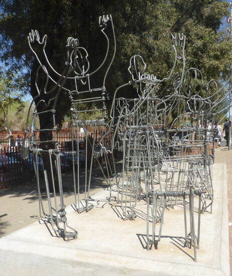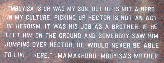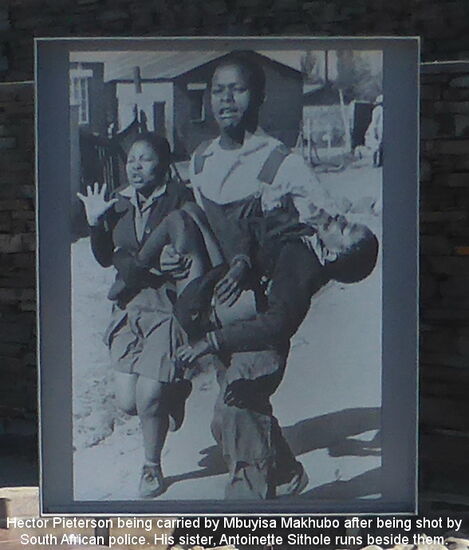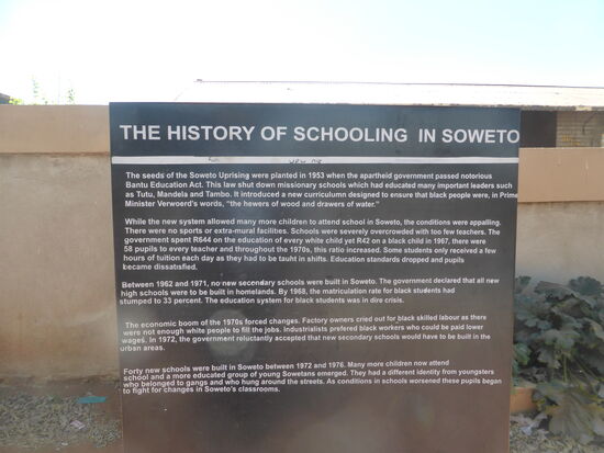 Unser erster Stopp ist am Mahnmal für die erschossenen Schüler Sowetos. Am 16. Juni 1976 protestierten Schüler und Studenten aus Soweto gegen die rassistische Bildungspolitik des Apartheidsregimes. Obwohl sie nur ungenügend in Englisch und Afrikaans unterrichtet worden waren, sollten die Prüfungen in diesen Sprachen abgelegt werden. Die Proteste eskalierten, die Polizei ging mit äußerster Härte gegen die Kinder und Jugendlichen vor. Es gab über 500 Tote. Als erstes Opfer gilt Hector Pieterson. Das weltbekannte Bild des sterbenden Pieterson, der von Mbuyisa Makhubo auf dem Arm getragen und von seiner Schwester Antoinette Sithole begleitet wird ist am Mahnmal zu sehen.