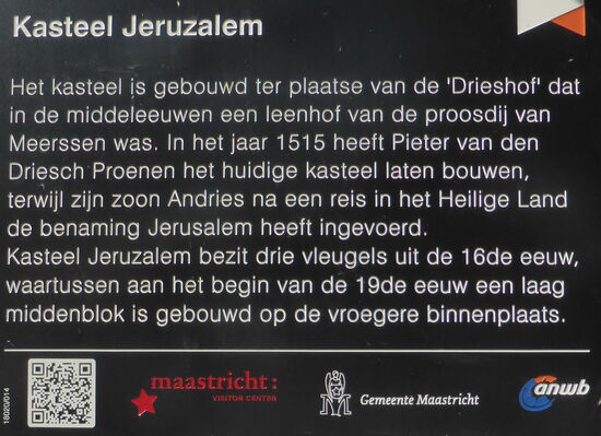 Das Schloss Jerusalem wurde im ersten Viertel des 16. Jahrhunderts von Pieter van den Driesch Proenen an der Stelle eines älteren Drieschhof-Hauses erbaut. Dieses Haus wurde 1515 durch einen Brand zerstört. Die Familie Proenen oder Pruyn hatte seit Generationen Verwaltungspositionen in Maastricht, Lüttich und Antwerpen inne . Die Burg gehörte zum Grundruhm der Beute von Meerssen . Peters Sohn Andries war Kanoniker und ritt auf das Kapitel der Liebfrauenkirche zu . Dieser Andries unternahm 1557 eine Reise ins Heilige Landund weil er von dem, was er dort gesehen hatte, so beeindruckt war, nannte er die Burg "Jerusalem". Das nahe gelegene Schloss Limmel erhielt wahrscheinlich den Namen " Bethlehem ".