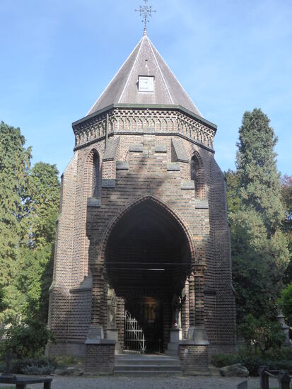 Die Friedhofskapelle wurde 1885 nach einem Entwurf des Architekten Johannes Kayser im reichen neugotischen Stil erbaut.
