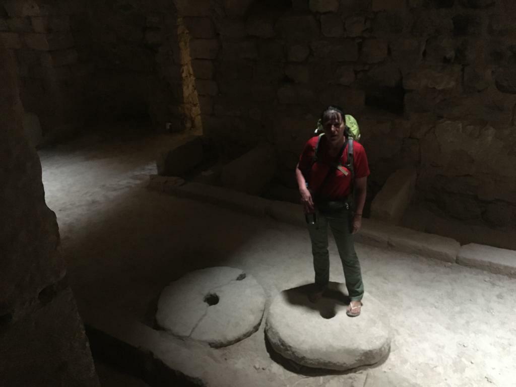Die Küche der Burg mit Mühlsteinen—evtl um Olivenöl zu erzeugen—so erklärt einer der deutschen Guides..