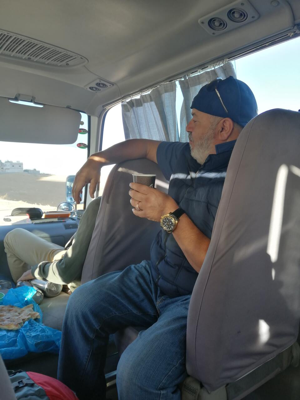 Wir stoppen und er holt für sich und uns Frühstück: warmes Fladenbrot und verschiedene Aufstriche—alles verteilt er großzügig im Bus