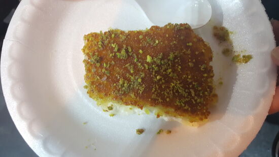 Schlange stehen ist angesagt! Dann bekommt man für 0.7 JD ein Stück warmen Schafskäse mit knusprigem Pistazien-Honig Mantel