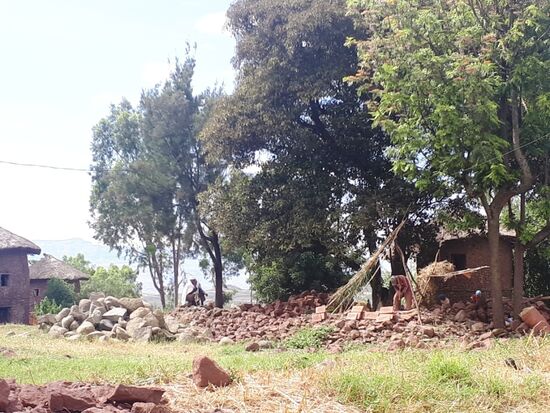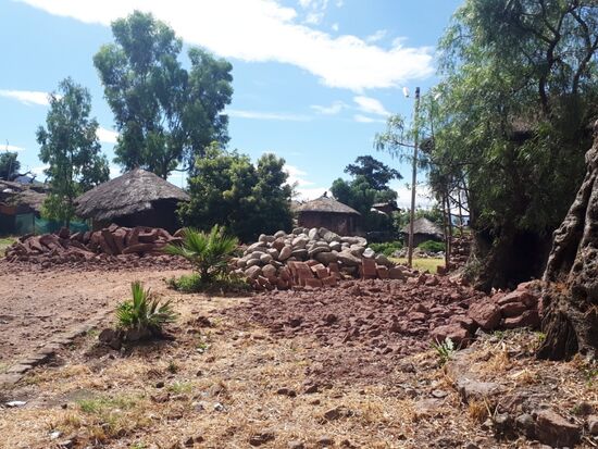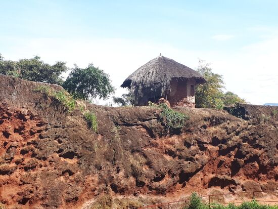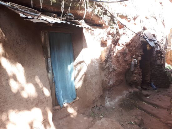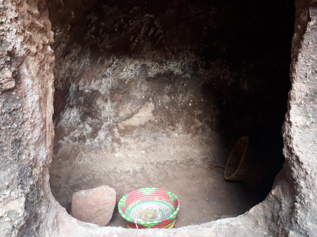 Am Beginn geht es durch das Wohnquartier. Hier stehen Tukkuls und links in den Felsen sind die Wohnhöhlen der Mönche untergebracht.