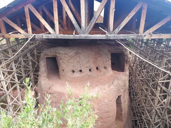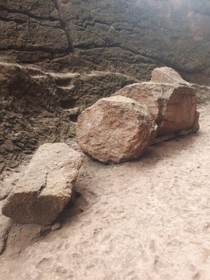 hier liegen Gebeine in einer der Grabkammern die rundherum in den Felsen waren. Bis auf Diese hier wurden alle Gräber um verlegt.