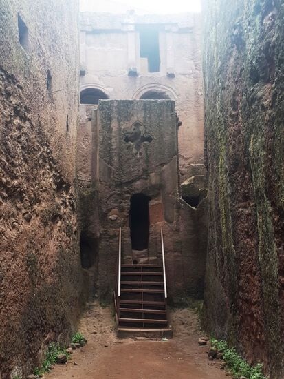 auf die hier hab ich gewartet - das ist die Kirche, von der vermutlich am Meisten Fotos gemacht werden. Die Kirche "Bete Giyorgis", die von oben das schöne Kreuz zeigt. Diese Kirche liegt etwas abseits der Anderen, ist aber ebenfalls über Wege zu erreichen und mit den Anderen verbunden.