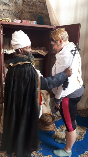Im Nebenraum zeigt uns der Priester die heilige Schrift / eine 1000 Jahre alte Bibel und die goldenen Kreuze.
