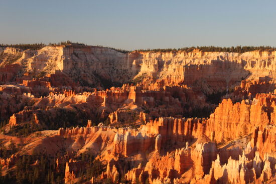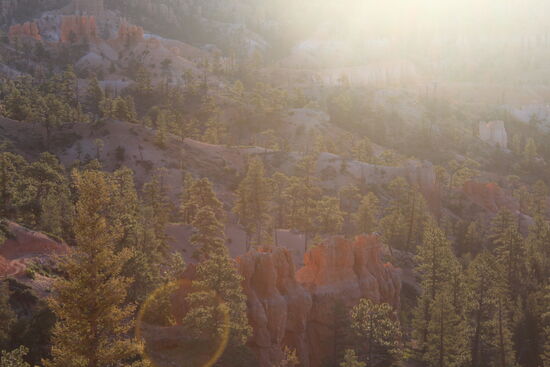 Heute stehen wir schon um 05:00 Uhr auf, um den Sonnenaufgang am Bryce Canyon zu sehen. Es ist saukalt, aber sehr schön. Als wir den Aussichtspunkt verlassen, werfen wir einen Blick auf die andere Seite des Canyons. Hier sieht eine Gesteinsformation aus, als würde ein Feuer darin lodern, da sich darin die aufgehende Sonne einfängt - sehr beeindruckend.