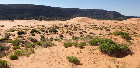 Zurück im Motel packen wir unsere Sachen und fahren los, Richtung Page. Unterwegs sehe ich ein Schild, auf dem "Choral Pink Sand Dunes" steht. Wir fahren hin. Der Eintritt kostet 10 $. Es ist eine interessante Landschaft. Zwischen den Sanddünen wachsen Sträucher und dahinter ist Wald.