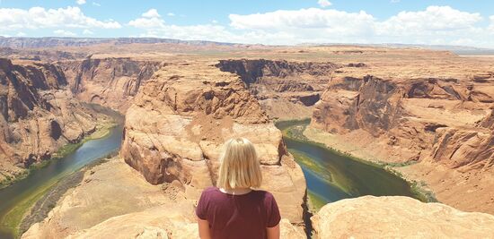 Wir fahren weiter zum "Horseshoe Band". Es ist fast heisser, als im Death Valley mit ca. 94 F. Wir müssen ein Stück gehen und die Sonne brennt vom Himmel. Die Aussicht ist wahnsinn! Um ein Foto zu machen, muss ich meine Höhenangst beiseite schieben. Hier sind viele Touristen und ich staune, wie nah manche am Abgrund Fotos machen. Da es sehr heiss ist, machen wir uns nach kurzer Zeit wieder auf den Rückweg,