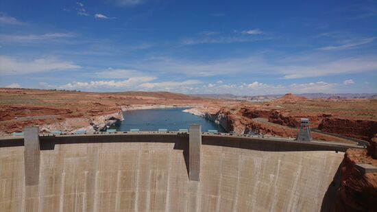 Heute stehen wir um ca. 08:00 Uhr auf. da wir gestern bereits im Antilope Canyon waren, gehen wir erstmal gemütlich Frühstücken. Das Hotel verspricht auf einem Pappaufsteller ein "Healthy Breakfast" - wohl nicht für europäische Standards. Wir packen unsere Badesachen ein und fahren los. Heute ist es wieder unerträglich heiss und wir hoffen, irgendwo schwimmen gehen zu können. Wir halten vor dem "Glen Canyon Dam" und gehen dort über die Brücke, es ist total faszinierend den großen Damm von der Nähe zu betrachten.