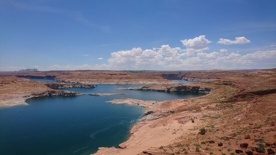 Auf der Weiterfahrt kommen wir in die "Glen Canyon recreation Area". Wir müssen hier wieder unseren Canyon Pass (den wir bereits im Yosemite Park gekauft haben) herzeigen. Diesmal muss ich mich zum ersten Mal ausweisen, blöderweise liegt der Reisepass im Kofferraum. Sehr unfreundlich lassen sie uns aber passieren, ohne dass wir diesen holen müssen. Wir sehen uns ein paar Aussichtsplattformen an und gehen uns noch ein bisschen im seichten Wasser abkühlen. Das Wasser ist sehr kalt und leider an den seichten Stellen sehr dreckig. Da es keinen Schattenplatz gibt, fahren wir gleich weiter. Wir sehen uns noch schnell das Visitor Center des Staudamms an, kehren aber bald wieder zurück ins Motel, da wir noch in den nassen Klamotten stecken.