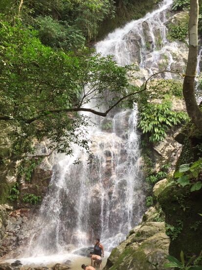 Man liegt hoch oben über dem Wasserfall auf Matten und soll sich wohl so entspannen ?!