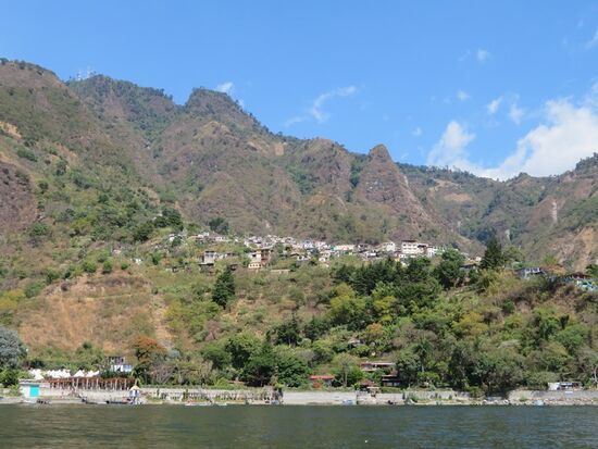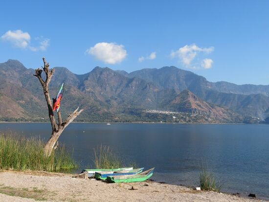 Von Antigua fahren wir 3 1/2 stunden mit dem Van nach San Pedro am Lago de Atitlán. Der See ist der zweitgrößte in Guatemala und ist bekannt für seine Fauna und Flora. Er hat eine Fläche von 130 km², ist von Ost nach West ca. 18 km lang und liegt ca. 1.560 Meter über dem Meeresspiegel. Er ist umgeben von drei Vulkanen Tolimán, Atitlán und San Pedro.