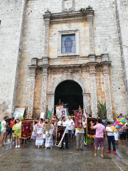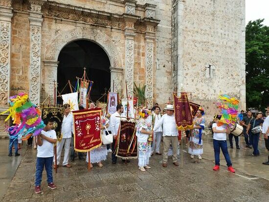 Wir erleben eine kirchliche Prozession, die im Platzregen unter schwarzen Wolken endet.