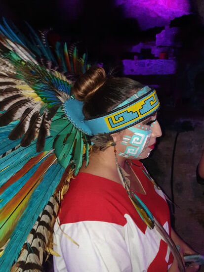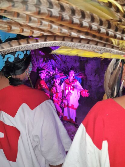 Die Cenote, die sich mitten im Ort befindet, ist bunt ausgeleuchtet und federgeschmückte Tänzer und Musiker bieten in dieser natürlichen Grotte ein ganz besonderes Spektakel !