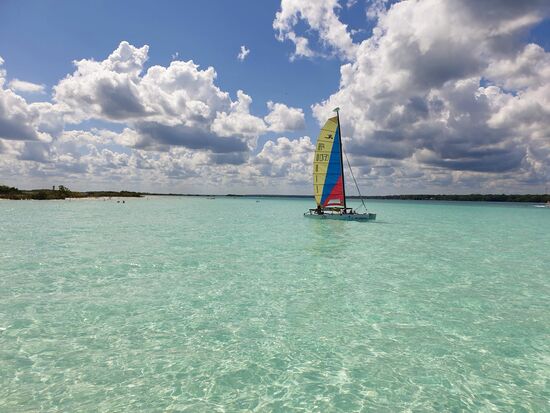 Nach unseren guten Erfahrungen in Rio Lagartos stand eine Lagunenrundfahrt nun auf unserem Programm. Wir wollten die 7 Farben erkunden, aber auch die beiden Cenoten, die sich direkt neben der Lagune befinden und sich mit ihr verbinden. Hier wechselt das Wasser abrupt seine Farbe und es geht von einem auf 120 Meter in die Tiefe.