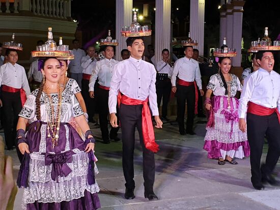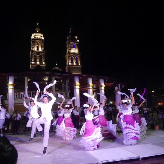 Gleich am ersten Abend erwartete uns auf dem Marktplatz eine Touristenveranstaltung. Die Tänzerinnen und Tänzer kannten wir fast schon, den der Stadtkern von Campeche ist klein, und die örtliche Tanzschule, in der immer alle Fenster offen stehen, ist natürlich hier mitten drin zu finden. Wir sind öfter vorbei gegangen, haben uns jedes mal über die Rhythmen gefreut, die die ganze Straße und die nahe gelegene Kirche beschallen und gerne sind wir an den Fenstern stehen geblieben, um für einige Momente beim Training zuzuschauen. Die Abendveranstaltung vor der hell illuminierten Kirche war stimmungsvoll. Kurios war der Tanz mit den Tequilatabletts auf den Köpfen der Tänzer.