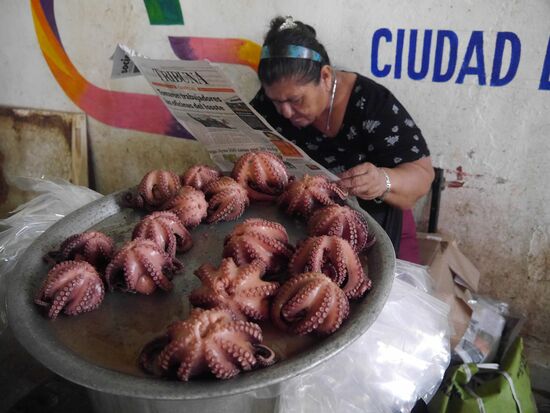 Obwohl wir morgens früh da waren, war es nicht übermäßig voll, trotzdem wuselig und genau richtig. Wie auf asiatischen Märkten gibt es auch in Mexiko einzelne Marktviertel, bzw. "Straßen". Früchte kann man in einem anderen Bereich kaufen, als Gemüse oder Fisch, Fleisch, Schuhe oder Kleidung. Wir haben uns hier einfach ein wenig treiben lassen.