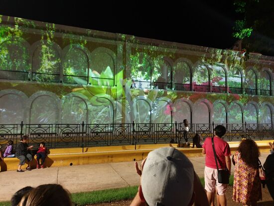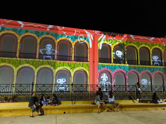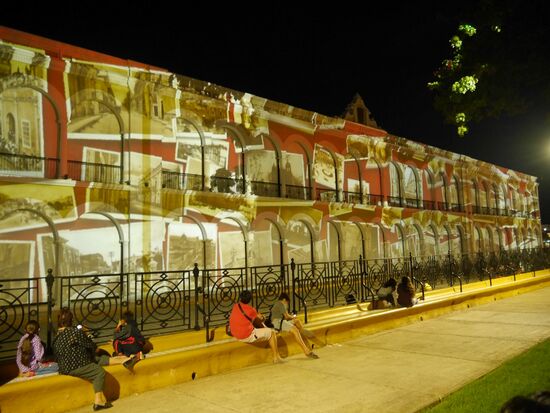 An unserem letzten Abend in Campeche haben wir nicht nur sündhaft teuer gegessen (endlich mal Fisch!), sondern es wartete noch ein kleines Highlight auf uns: eine gut gemachte, genau auf das rieisge Projektionsgebäude zugeschnittene Licht- und Soundshow erzählte in witzigen Bildern die wechselvolle Geschichte der Stadt. Genau so bunt wie Campeche selber!