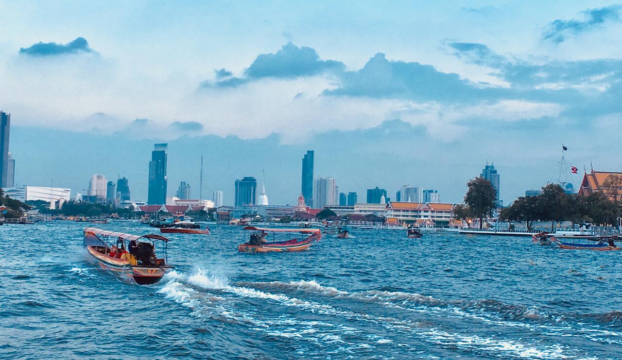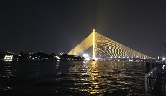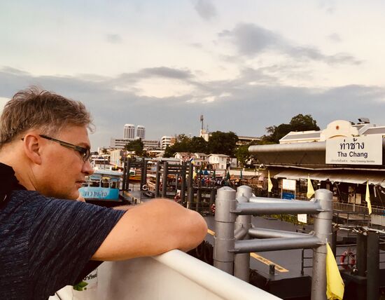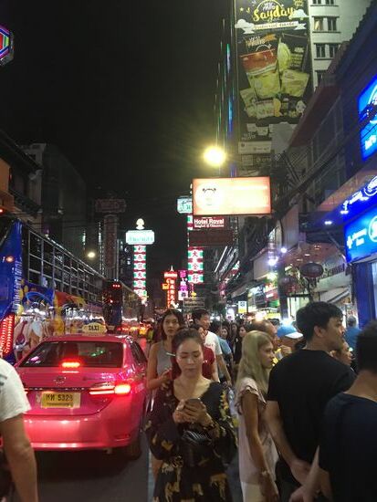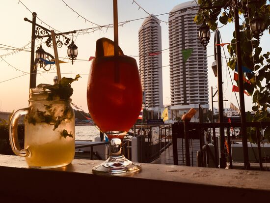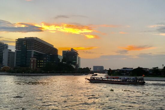 Weiter geht es frisch gestärkt in das angeblich so tolle Backpackerviertel in die Kao San Road. Für uns ungewöhnlich, wurden wir andauernd angequatscht, ob wir nicht hier was möchten oder da, was wir sonst nur aus der Türkei kennen und die letzten 2 Tage überhaupt nicht erlebt haben..... etwas nervig. Ich muss vielleicht dazu sagen, dass wir in einem kleinen etwa 3km außerhalb des Stadtzentrums gelegenen Hotel übernachten, wo tatsächlich sehr wenige Touristen zu finden sind und wir eigentlich kaum wahrgenommen werden. Was uns eindeutig besser gefällt. Nichts desto trotz trinken wir was nettes und beobachten das Treiben. Es werden immer mehr Leute.... langsam wird sich auf das Nachtleben vorbereitet.... wir brechen auf und wollen zum Fluss. Wir lassen uns schon wieder von einem Tuk Tuk Fahrer anquatschen: Sunset ... I drive you to the Sunset on the River, please come with me, only 20 Baht ....na klar machen wir! Und los geht es..... kurze rasante Fahrt, netter Mann, nur sollten wir eine überteuerte Klongfahrt machen, welche wir aber nicht wollten! Der anfangs nette Mann dann völlig entgeistert und nicht mehr ganz so nett: Madam the Sunset.... please ... die erst überteuerte Longtailbootsfahrt von 1200 Baht pro Person wurde dann auf einmal für 600 Baht ( 18€) pro Person angeboten, aber wir lehnen dankend ab.....wir gehen weiter am Fluss entlang und Hunger kommt auf. Wir essen heute mal im Restaurant am Wasser, sehr lecker mit guten Cocktails .... glücklich, satt und etwas beschwipst treten wir den Heimweg an. Wir laufen die 3 km und trauen uns tatsächlich über die gefährliche Straße .... wir sind angekommen in der trubeligen Großstadt....