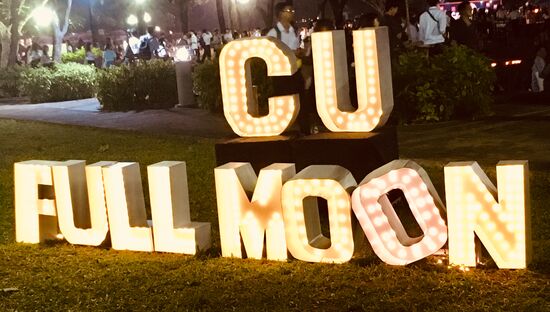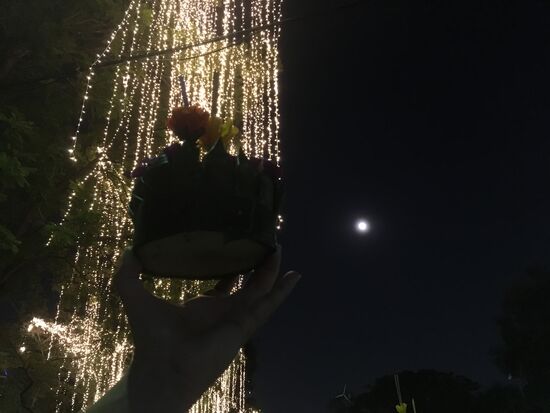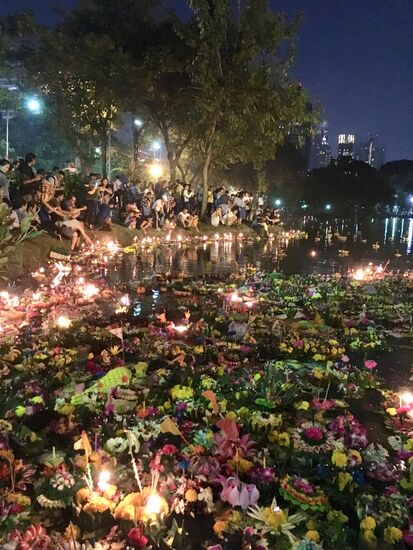 Wir erreichen den erleuchteten Park und kaufen unseren Krathong und gesellen uns zu den anderen ans Wasser. Wir zünden die Kerze und die Räucherstäbchen an, jeder wünscht sich etwas und ich setze das Teil ins Wasser. Schöne Stimmung, trotz der vielen Menschen!