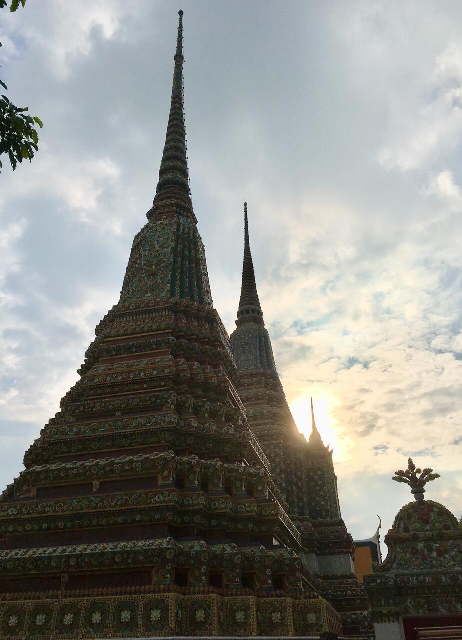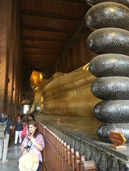 Wir wollen heute zum Wat Pho. Wat Pho ist ein Königlicher Tempel Erster Klasse, ein buddhistischer Tempel (Wat), der im Zentrum der historischen Altstadt von Bangkok liegt, unmittelbar südlich des Königspalastes.Der Wat Pho (liegender Buddha Bangkok) ist vor allem durch sein Wahrzeichen bekannt und bei Touristen beliebt: Der 46 Meter langen und 15 Meter hohen Buddha Statur, die komplett vergoldet ist. Alleine die Füße des Wat Pho Buddha sind stolze 5 Meter hoch. Für 200 Baht (6€) pro Person geht’s rein