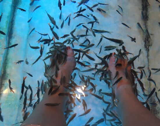 Wir machen uns langsam auf den Weg zur Fähre und sehen ein Fishspa.... spontan beschließen wir das mal auszuprobieren ! 15 Minuten für 200 Baht (6€) pro Person, Füße fix gewaschen und dann rein ins Becken.... Wow so ein Gefühl hatten wir noch nie.... wir müssen uns echt beherrschen , es kitzelt, irgendwie zwickt es und es kostet am Anfang ein klein bisschen Überwindung die Füße nicht sofort wieder aus dem Wasser zu ziehen. Aber dann geht’s und wir sind begeistert! Nach 15 Minuten haben wir butterweiche Babyfüsse!!!!