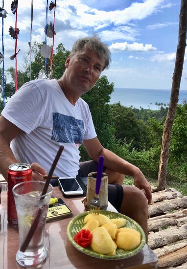Heute geht’s in den Osten der Insel...wir fahren an mehreren kleinen Orten vorbei und es fängt an zu regnen, so dass wir in einem netten Lokal den Regenguss abwarten müssen. Beim Lesen der Karte wird auf den besonderen Kaffee aus Chiang Mai im Norden Thailands aufmerksam gemacht. Also probieren wir den. Oberlecker, mit leckerer Schokotortenempfehlung! Den Zucker fürn Kaffee finden wir ebenfalls lecker( es ist Rohrzucker, aber gänzlich unbehandelt, so kenne ich den nicht) .... man erklärt uns den kann man in Oldtown kaufen, so ein Glück, da wollten wir ja auch noch hin ....der Kaffee wird auch gekauft und Jack der nette Besitzer schenkt uns noch 2 Kaffeetüten zum selbst aufbrühen, wie nett!