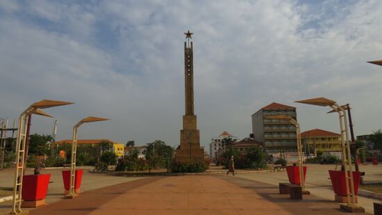 wo man als Autofahrer ohne jedes Drängeln und Hupen vorwärts kommt. Wir beziehen unseren CP heute beim Gorila Hostel (CFA 6.500 pP) und machen uns dann gleich mal auf den Weg zur Botschaft von Guinea, auf der wir morgen früh unser nächstes Visum beantragen wollen. Wir kommen so auch am streng bewachten Präsidentenpalast vorbei, dürfen aber nur diese daneben stehende Heldengedächtnissäule fotografieren.