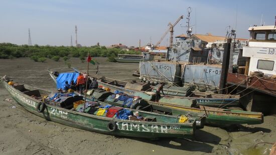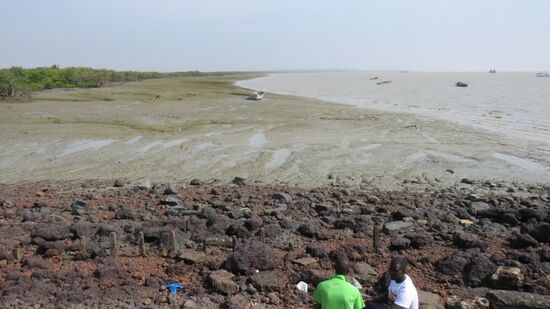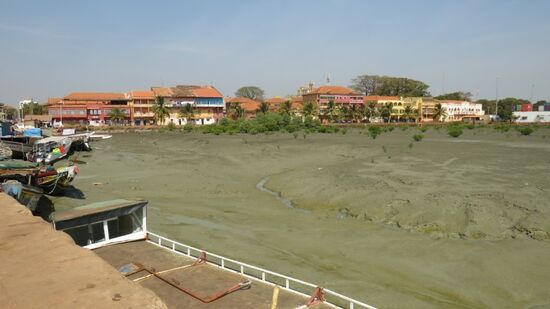 gehen weiter zur Botschaft von Guinea, werden dort gegen 9:00 vom Wächter gleich freudig begrüßt und persönlich zur Konsulatsabteilung geführt. Hier müssen wir einen Fragebogen ausfüllen, Pässe, je 2 Passbilder und CFA 30.000 abgeben und schon werden wir mit der Mitteilung: ‚Heute, um 14:30 sind Eure Visa fertig‘ wieder entlassen. Das ging ja echt fix, da wollen wir doch unser Glück gleich nochmals versuchen. Praktisch um die Ecke ist die Botschaft der Elfenbein Küste (Cote d‘ Ivoire, wie der offizielle Name lautet) und kaum haben wir der netten Dame mit unserem Franko-Spanisch-Portugiesisch unser Anliegen erklärt, legt sie uns auch schon zwei Fragebogen vor, deren Ausfüllen mit ihrer tatkräftigen Hilfe und Unterstützung blitzschnell erledigt ist. So bekommen wir für Unterkunftadressen und potentielle Reiseziele schnell mal den Bogen eines Vorreisenden zum Abschreiben, wir übergeben ihr 1 Foto und unserer (Zweit-Pässe) und dann wird der Konsularbeamte herbestellt, der uns verspricht, bis Morgen 10h sind auch diese Visa in unserem Pass, nur die Kosten wegen dieses 3-Monatsvisums muss er noch mit Irgendjemand / Irgendwo klären. 10:30 schon 2 Visa erfolgreich beantragt, Zeit zur Stadtbesichtigung. Wir gehen zum alten Fort, einst von den Portugiesen erbaut, heute von der Armee benutzt und daher Fotografierverbot. Drunten am Fluss, am Hafen, ist Ebbe, weit und breit nur Schlick und Schlamm.