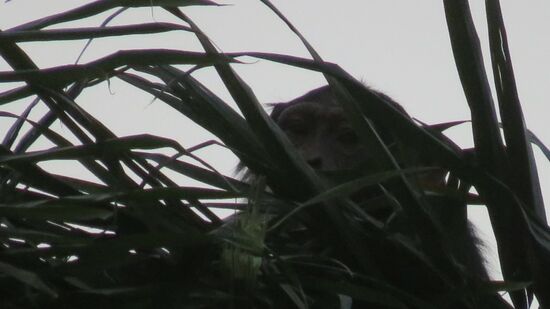 In diesem kleinen Ort ist das Hauptquartier des Cantanhez NP, wo wir neben dem Eintritt von FCA 2.000 pP, noch Schimpansen Beobachtungsgebühr von FCA 8.000 pP und die Gebühr für den obligatorischen Führer von FCA 5.000 pP bezahlen. Morgens um 5h treffen wir unseren Führer und fahren nun mit ihm ‘in einem lehmigen, trockenen Bachbett‘ – besser lässt sich dieses Stück Weg nicht beschreiben – weitere 4km Richtung Süden bis hinter das Dorf Madina. Hier erwartet uns ein zweiter Führer und bei noch völliger Dunkelheit stolpern wir auf Dschungelpfaden durch den Urwald. Irgendwann ist dann absolute Ruhe und Warten angesagt, denn wir haben gegen 6h die Schlafbäume der Schimpansen erreicht, um 7:15 geht die Sonne auf, erste Bewegungen droben in den Palmen, dann endlich kann trotz Gegenlicht ein klares Foto gemacht werden, Mission erfüllt.